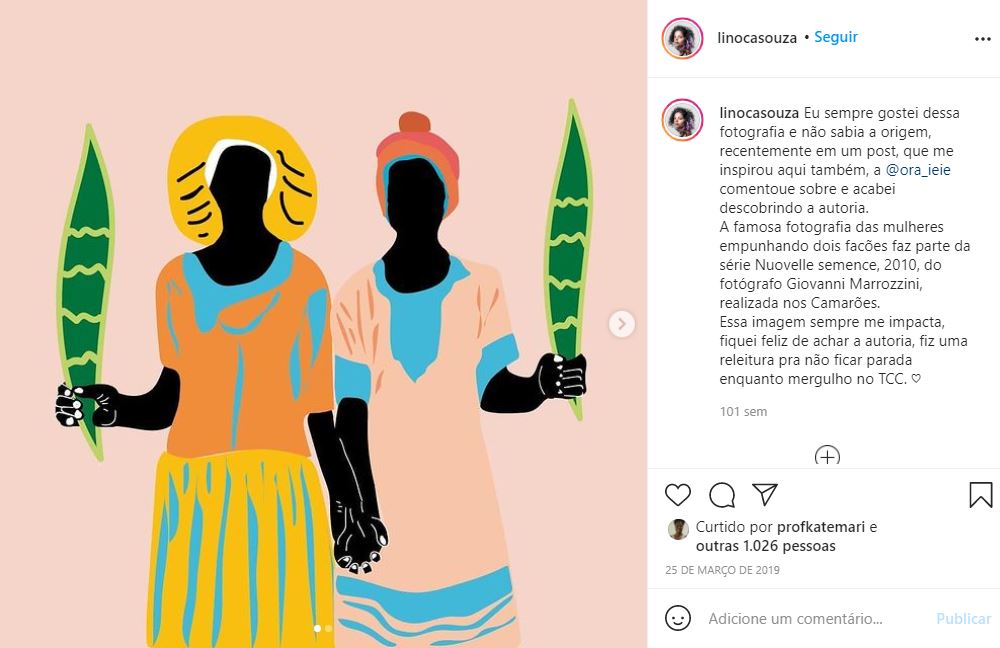 Desde a capa é possível identificar a ancestralidade africana de suas personagens. E a ilustração concretiza esse encontro, ao se inspirar em duas trabalhadoras rurais clicadas pelo fotógrafo Giovanni Marrozzini, na Aldeia Abam, em Camarões, na África: