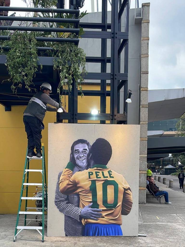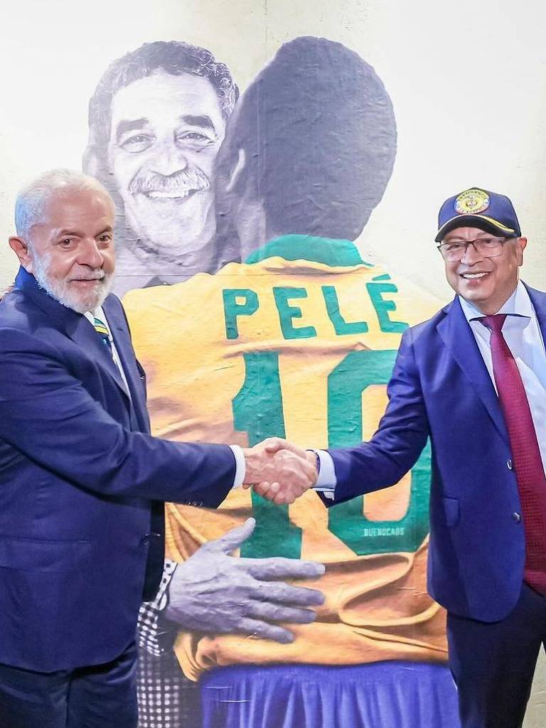 Lula e Petro em frente à fotomontagem da série “Pelé Beijoqueiro” de Luis Bueno, em Bogotá. Na fotomontagem o escritor colombiano Gabriel García Márquez e Pelé. Foto: redes sociais do presidente Lula.